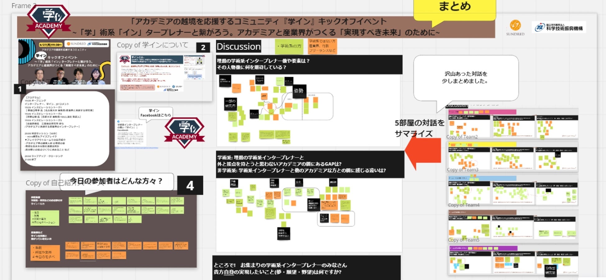 6月に開催した学インキックオフにて、産業界と学術界インタープレナーが対話したセッションのmiroボードを公開します。学術界のインタープレナーに求められる価値観や理想像、阻害しているものなど、社会とのつながりを重視する学術系インタープレナーの想いをご覧ください。