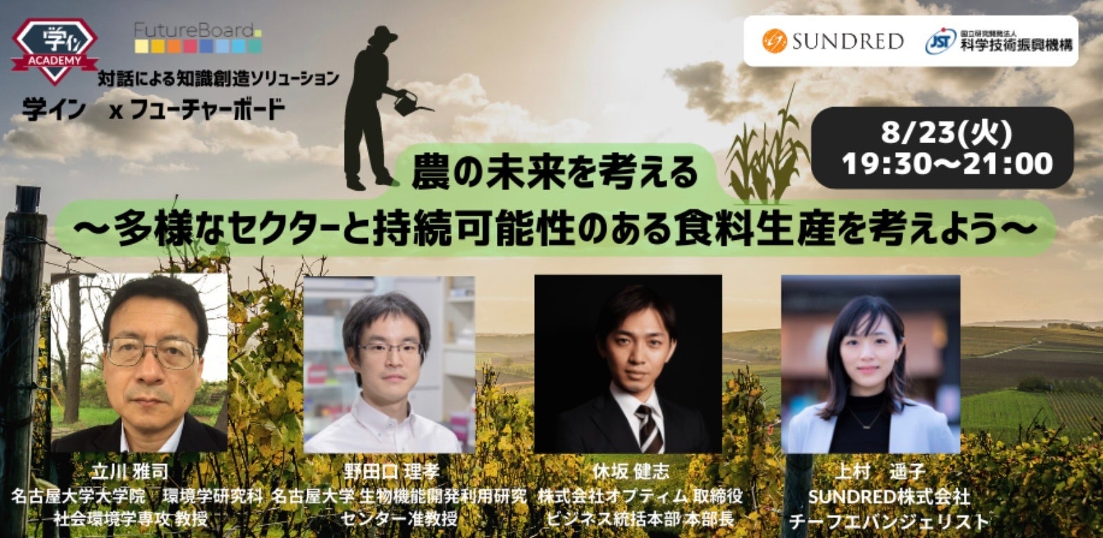 今回のイベントには、遺伝子組換え作物に関する研究を進める名古屋⼤学の立川 雅司先生や、接ぎ木の技術を研究する同大学の野田口 理孝先生、農業DXを進める株式会社オプティム取締役の休坂 健志氏が参加。3名のインスピレーショントークを元に、新産業創出に向けた知識創造・蓄積・発展を促すソリューション「フューチャーボード」を使って、視聴者参加型で農業の未来に向けた課題感や期待を可視化し、集約していきます。