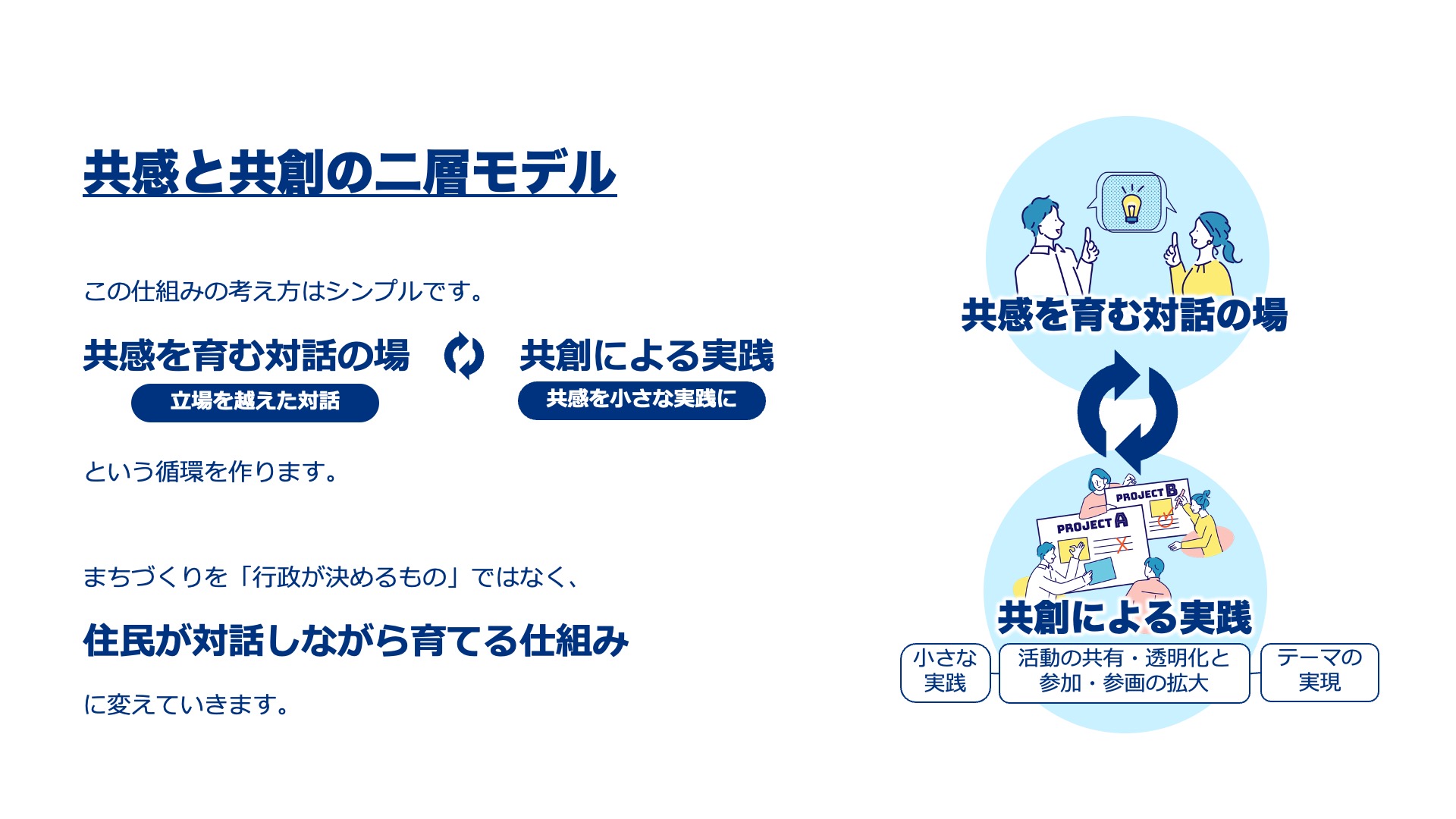 今後は「共感と共創の二層モデル」を通じた住民主体のプロジェクトで実現していく予定です。