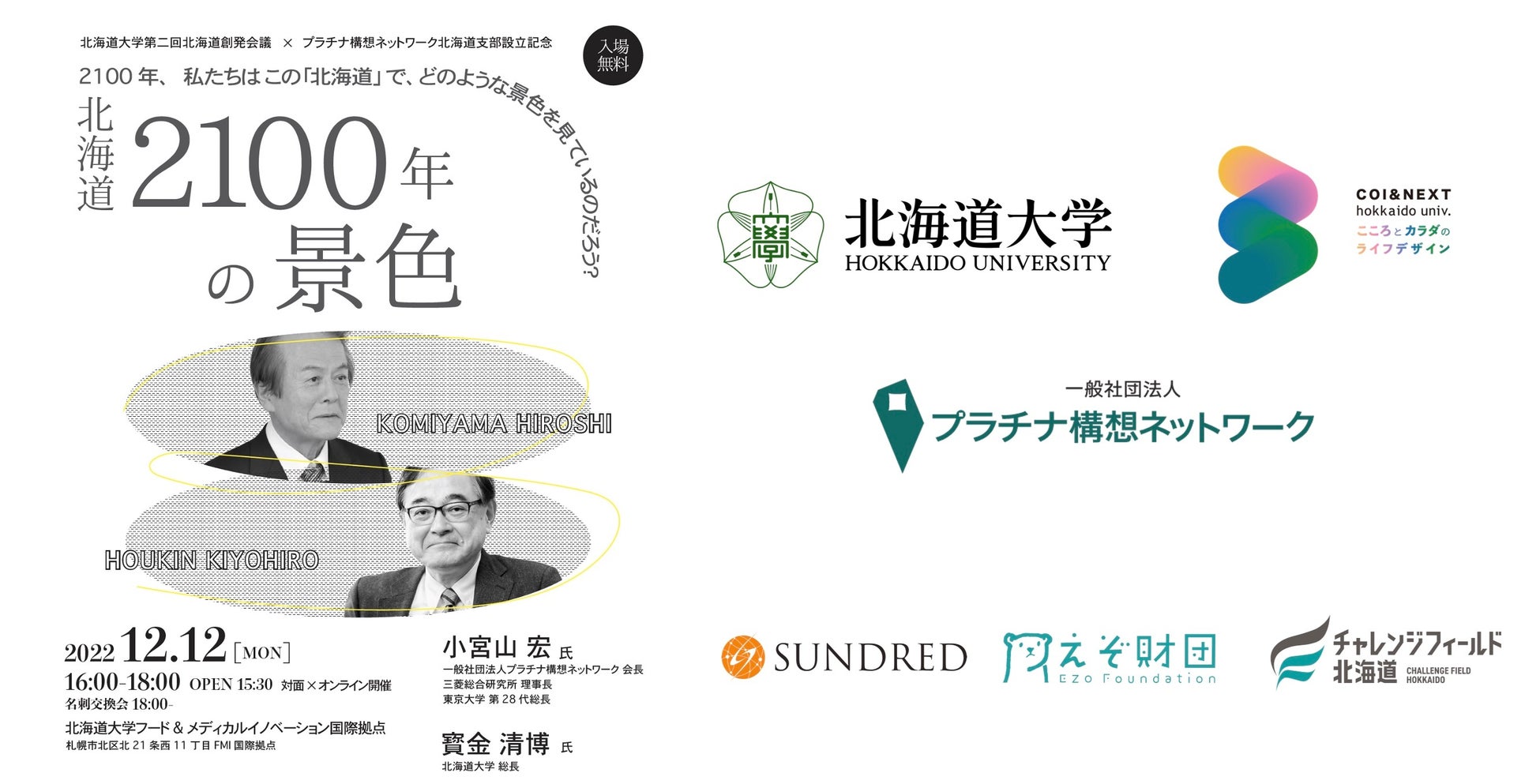 北海道の次の100年に向け、「北海道2100年の景色」をテーマに、vision「プラチナ社会=地球が持続し、豊かで、すべての人の自己実現を可能にする社会」を掲げ活動するプラチナ構想ネットワークの小宮山 宏氏と、“「光」は「北」から、「北」から「世界」へ”をスローガンに、社会と歩む卓越大学「Accessible Excellence」を目指し活動する北海道大学総長の寳金 清博氏が対談します。共に、“北海道の未来の景色”、“私たちのWell-being”、“私たちの幸せ” についてゆっくり考えましょう。