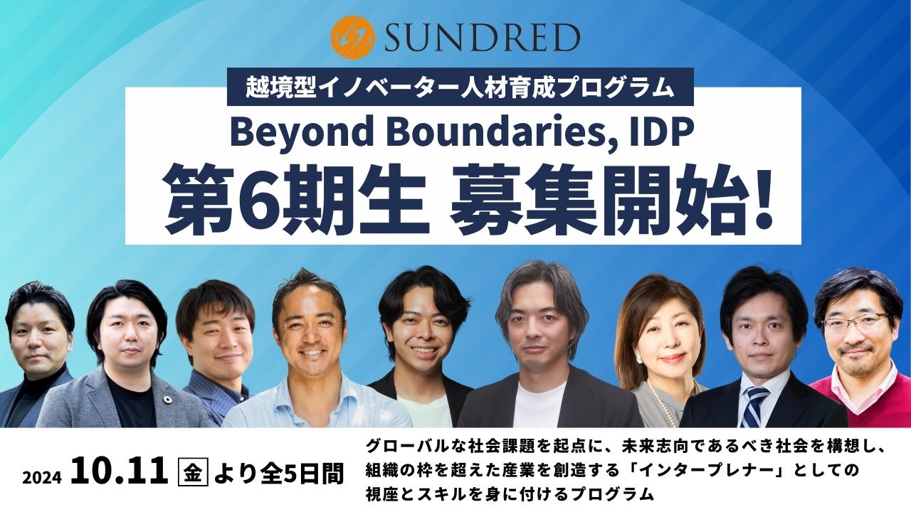 100個の新産業の共創を目指す「新産業のエコシステムビルダー」SUNDRED株式会社(所在地:東京都渋谷区、代表取締役CEO兼GM:留目 真伸、以下:SUNDRED)は、次世代リーダー・イノベーターを育成するための越境型イノベーター人材育成プログラム「Beyond Boundaries – IDP(※1)」第6期(2024年10月11日〜12月6日、全5日開催)の受講者の募集を開始しました。本プログラムは、グローバルな社会課題を起点に、未来志向であるべき社会を構想し、組織の枠を超えた産業を創造する「インタープレナー」を育成するための全5日のワークショップ・実践型プログラムです。
